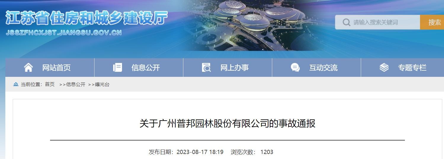 2023年8月2日14时左右,由广州普邦园林股份有限公司总承包、江苏神州项目管理有限公司监理的淮安堂悦项目园林绿化(生态)工程,发生一起高处坠落生产安全事故,致1人死亡,现通报如下: