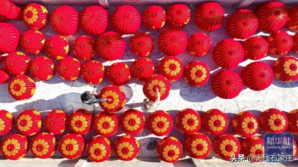 12月16日,在河北省石家庄市藁城区梅花镇屯头村一家宫灯生产厂,工人在晾晒宫灯。新华社发(梁子栋 摄)