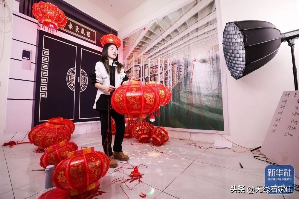 12月16日,在河北省石家庄市藁城区梅花镇屯头村宫灯直播基地,工作人员通过直播方式销售宫灯。新华社发(梁子栋 摄)