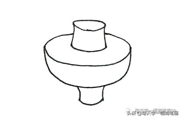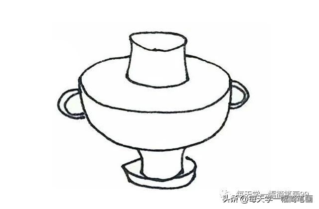 火锅简笔画步骤五:下面画上椭圆形的底座,加上一点厚度,锅体的两边再加上圆环的装饰。