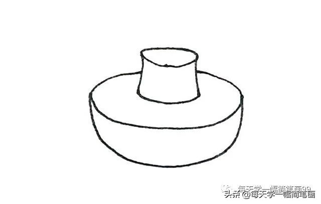 火锅简笔画步骤三:接着在下面再画上一个大一些的椭圆形,以及半圆形成锅体。