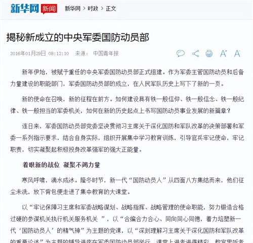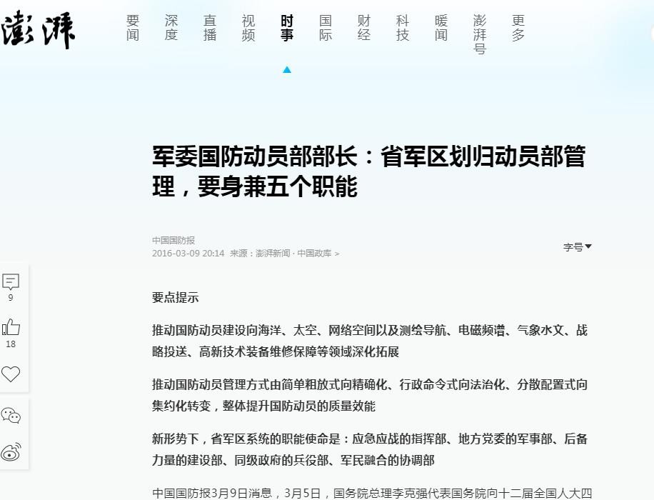 澎湃新闻,军委国防动员部部长:省军区划归动员部管理,要身兼五个职能