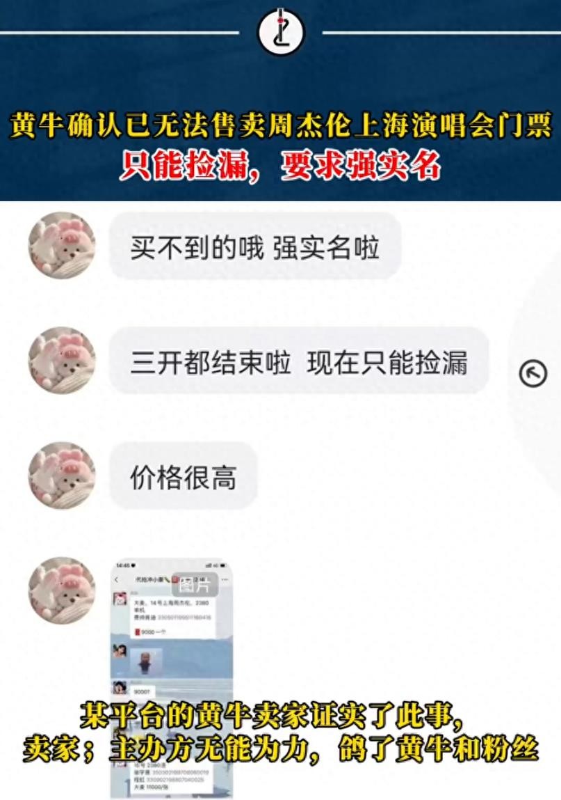 据新闻晨报的“021视频”从二手交易平台上的黄牛卖家处了解到,目前黄牛已无法售卖周杰伦上海站演唱会门票,用户只能靠捡漏了,并且已经严格要求实名制。对于网上所说的“无法录入信息”,黄牛也确认了,并表示主办方无能为力,既鸽了黄牛也鸽了粉丝。