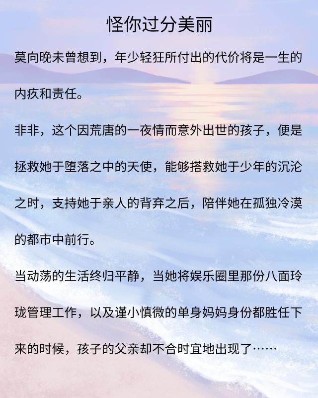 《怪你过分美丽》讲述的是莫向晚和莫北的爱情故事,年少时,两人都曾堕落,莫向晚因为父母离异,无家可归的她便开始自暴自弃,经常晚上与他人出门玩乐。