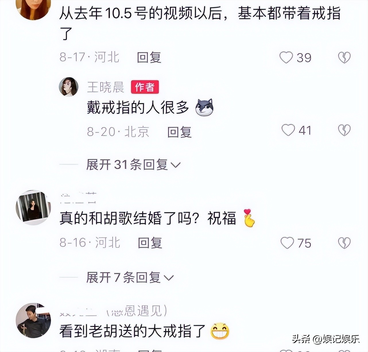 她的评论区也充斥着跟胡歌相关的言论,王晓晨回应:戴戒指的人很多!