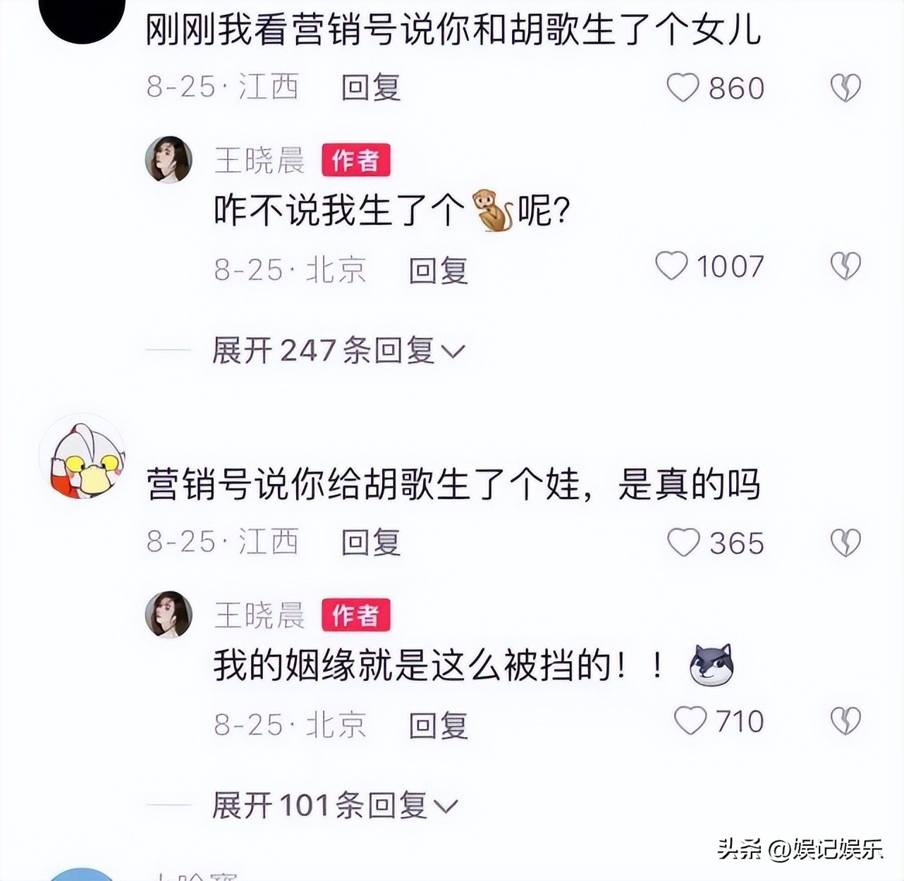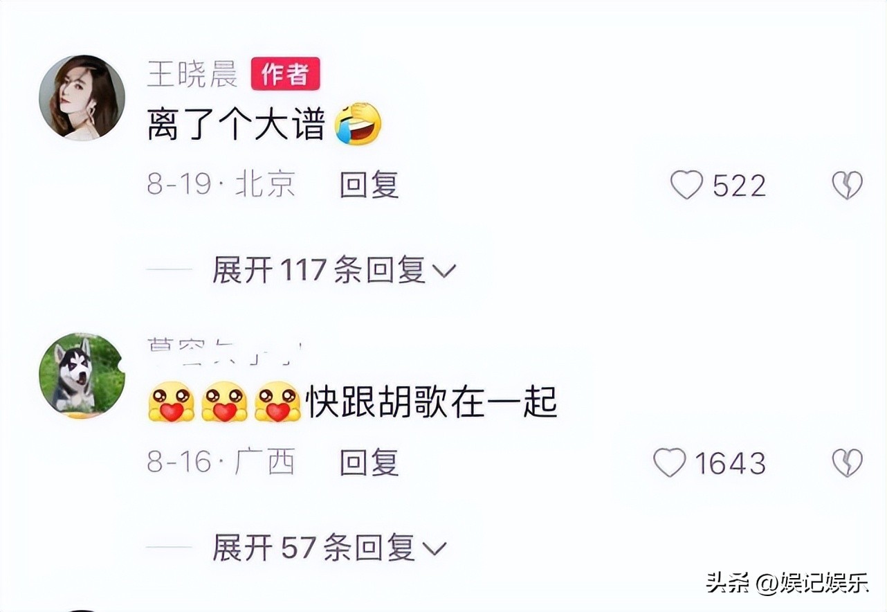 同时王晓晨直接回应了跟胡歌有关的评论,说:我的姻缘就是这么被挡的!这算是正面否认了跟胡歌的相关传言。