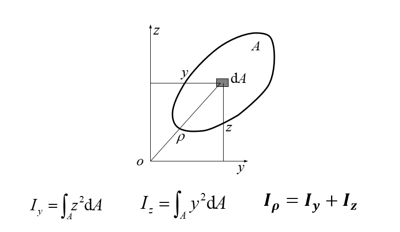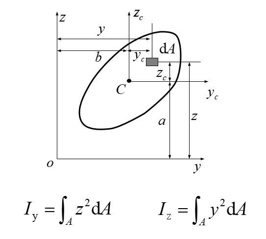 Iy、Iz图形对y轴和z轴的惯性矩; 惯性矩的量纲为[长度]4; 惯性矩的大小与图形面积、图形面积相对于坐标轴的分布有关; 面积离坐标轴越远,惯性矩越大。