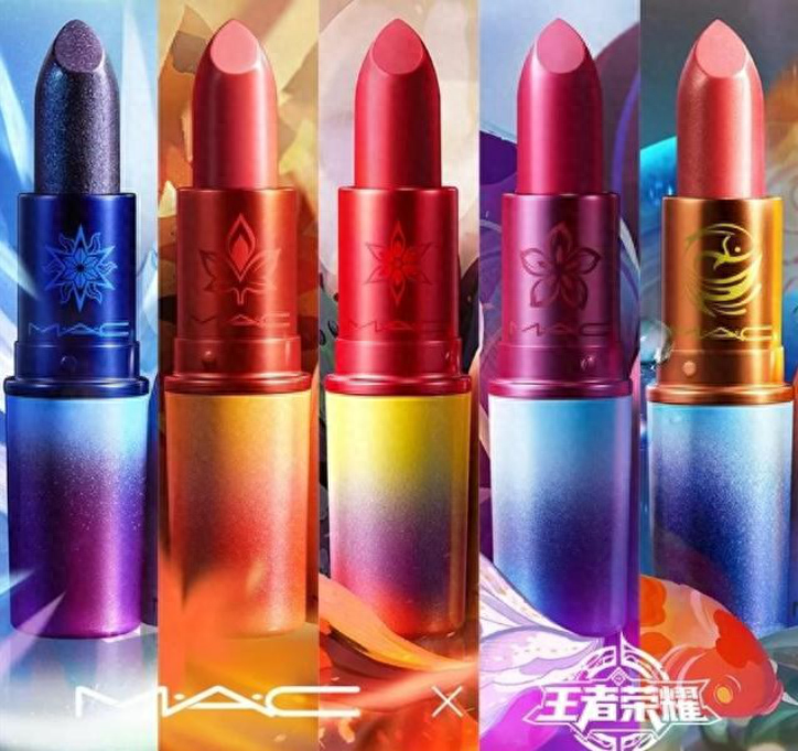 △MAC和王者荣耀联名款口红,共5个颜色,分别对应王者荣耀里不同的人物,不同的外壳也是和5位女英雄对应的渐变色系