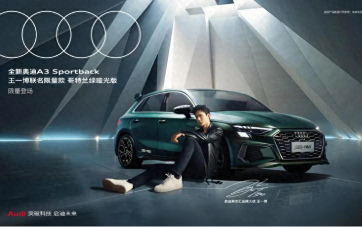 11月中旬,新奥迪A3发布了与王一博合作的联名限量版,全球限量23台,其中锰石黑20台,特兰绿3台。在汽车行业联名虽然早已不是新鲜事,但这样的产品形式还是引起了一些轰动,因为这个限量款不是简单地找了王一博做代言,而是基于A3 Sportback车型,在外观上整体进行了较大改装:前格栅和尾翼采用了碳纤维材质,前进气格栅、前翼子板、后车门处都有奥迪与YIBO的联合logo,迎宾灯的图案也采用联合logo,车内也体现了限量版的特殊性,内饰条上有王一博的签名,中央扶手烫印联合logo——这样的汽车联名款堪称煞费苦心。