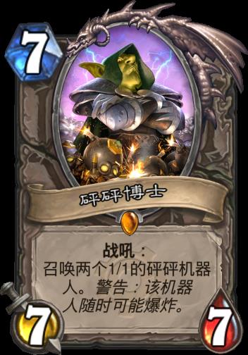 砰砰博士这张牌说强也确实很强,但随着新版本一代代更替下来,他的炉石第一橙卡恐怕要让位(没错就是巫妖王)。如果入坑晚的朋友没有领教过他的绝代风华,那么用一张蓝龙人或绿皮船长代替吧,当然也是老问题,强度会降。