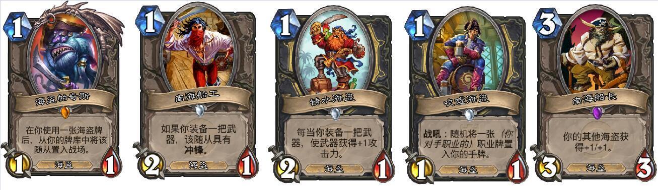 由于没有携带橙法,不能像标准那样亡命一击,我们更注重每个回合的站场和解场。其中海盗流是我们获取最大利益的一套体系:帕奇斯虽被削弱,但被拉出铺场、压缩牌库还是能用;嘘嘘剽窃补牌外加梦想,锈水给刀加攻,哈哈配合手刀冲锋,他们在船长的buff下都属于身材超模+特效超模的存在。有了这些海盗之间的关联,很容易使3费之前的场面无限有利于我们。即使中后期摸到,也能互相联动起来,不会像标准的鼹鼠和银色侍从那样后期鬼抽只能当触发连击的前置牌(帕奇斯除外)。