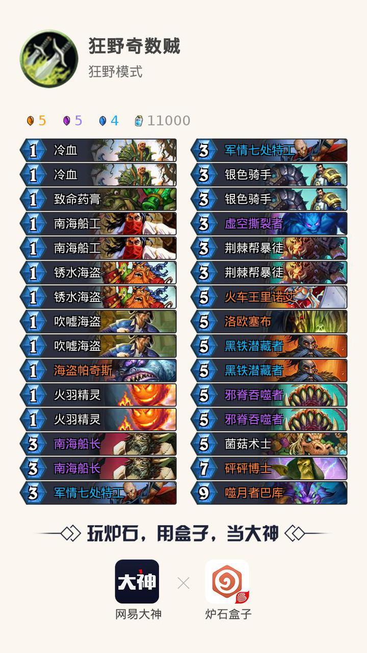 狂野大师赛已经开始了,大家赶快跟上潮流,来狂野嗨皮一下吧。今天给大家带来一篇狂野上传说的奇数贼攻略,本人1级摩擦了2天终于在3号中午上了传说,然后趁着环境好,立马把小号也从11级打到了低保。卡组和胜率图如下: