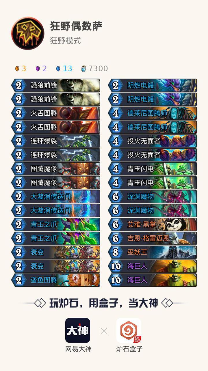 首先分析对面卡组:图腾魔像、蛮鱼图腾、投火无面者/德莱尼图腾师/载人收割机、艾雅、深渊魔物和巫妖王属于超模站场随从,在它们固定的回合按时上会给局面造成巨大压力。衰变是群沉默,大漩涡是AOE,青玉之爪、连环爆裂和青玉闪电进可打脸退可解怪。恐狼和火舌配合场面可以以小换大,甚至加速打脸。电鳗和海巨人返场、扩大优势。