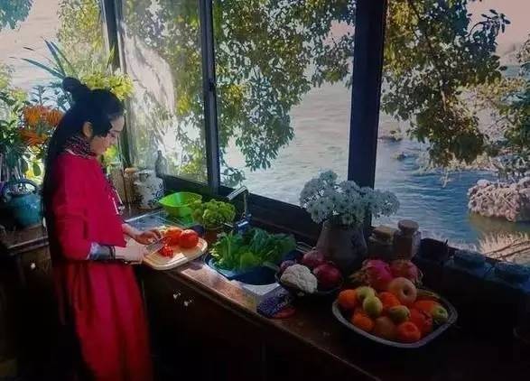 她下厨切菜,