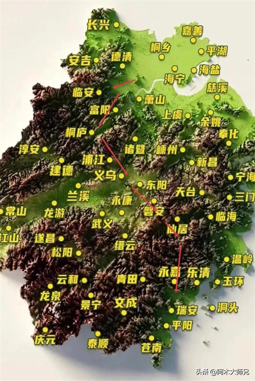 大家看这张浙江地形图,红色箭头就是杭温高铁的线路。