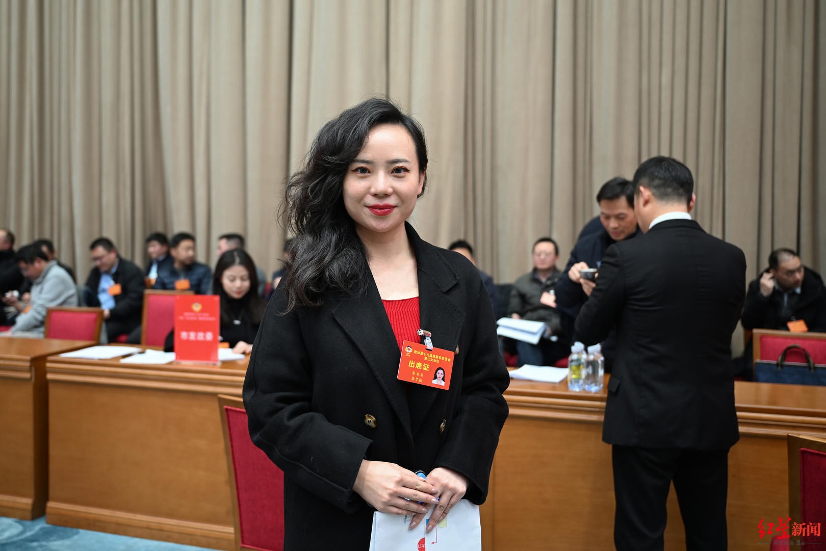 会场一侧,成都市政协委员、成都市海外留学归国人员协会会长、成都市侨联青委会会长彭肖肖带着厚厚的数据坐在了成都市人民政府副市长、成都市发展改革委党组书记、主任王锋君的座位前。