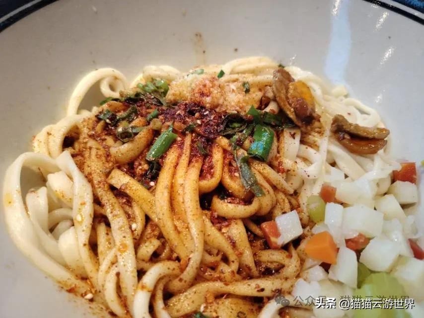 biangbiang面是陕西八大怪之一,面条宽如裤带,吃起来十分有嚼劲。搭配油泼辣子和醋,再泼点热油,太香了。