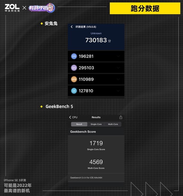首先进行的是基准性能测试,在的安兔兔V9版本跑分测试中,4GB RAM的iPhone SE 3获得了73W分的成绩,这一成绩接近iPhone 12的表现。在能够准确反映手机SoC CPU部分性能表现的GeekBench 5测试中,iPhone SE 3的GeekBench CPU单核跑分实测成绩为1719分、CPU多核跑分成绩为4569分,整体得分基本与iPhone 13持平。