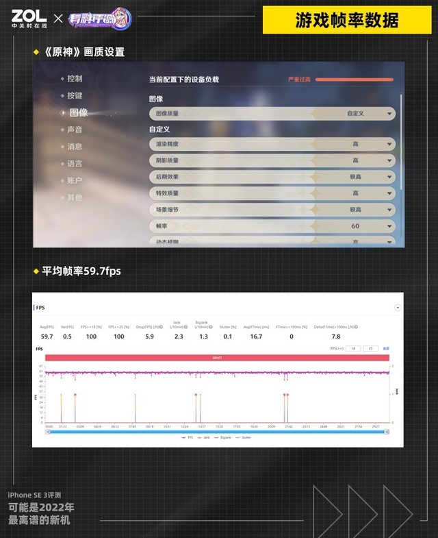 由于iPhone SE 3搭载了A15处理器并拥有单层主板设计,因此其游戏帧率实测数据非常优秀。在知名手机性能评测专用手游《原神》的测试中,我们将画质选项设置为极高画质+60帧,iPhone SE 3 30分钟游戏的实测平均帧率为59.7帧,帧率曲线波动较小,整体表现极为出色。