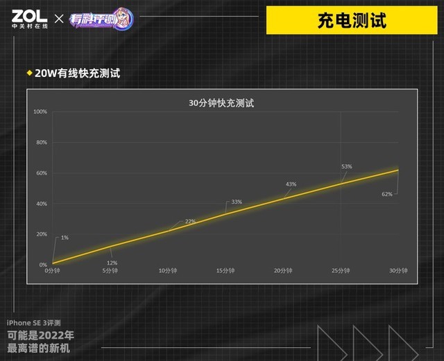 在使用20W PD充电器的情况下,通过实际测试,iPhone SE 3可以在30分钟内将电池电量从即将耗尽充至62%,充电速度表现符合预期。