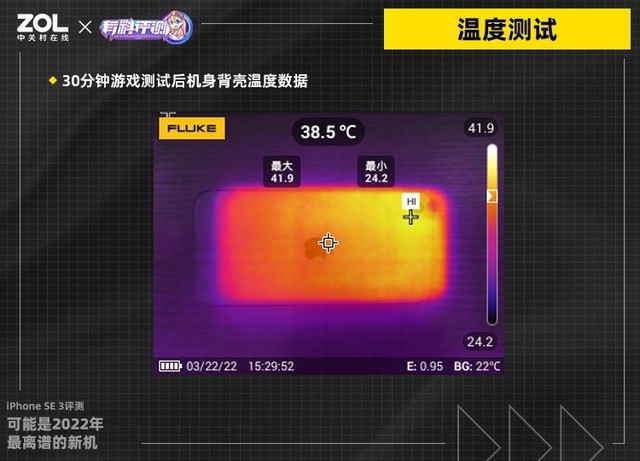在游戏测试过程中,我们还对iPhone SE 3的机身后盖温度进行了测试。经测量,在经过30分钟高强度的游戏实测之后,iPhone SE 3后盖的平均温度为39.5摄氏度,能够看出基于单层主板设计的iPhone SE 3持续性能表现和散热效果优于iPhone 13。