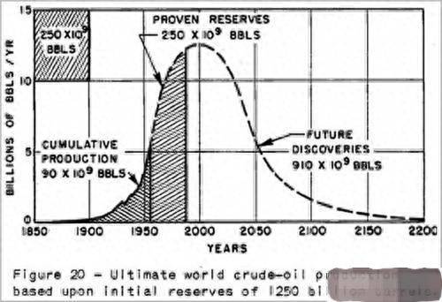 首先我们要知道的是,石油会枯竭这件事最初的来源是著名物理学家哈伯特,他根据当时的技术手段,以及对石油的需求量,绘制了一张石油储量图。他认为石油开采量将会在上个世纪70年代达到顶峰,然后再慢慢下降,直到枯竭。