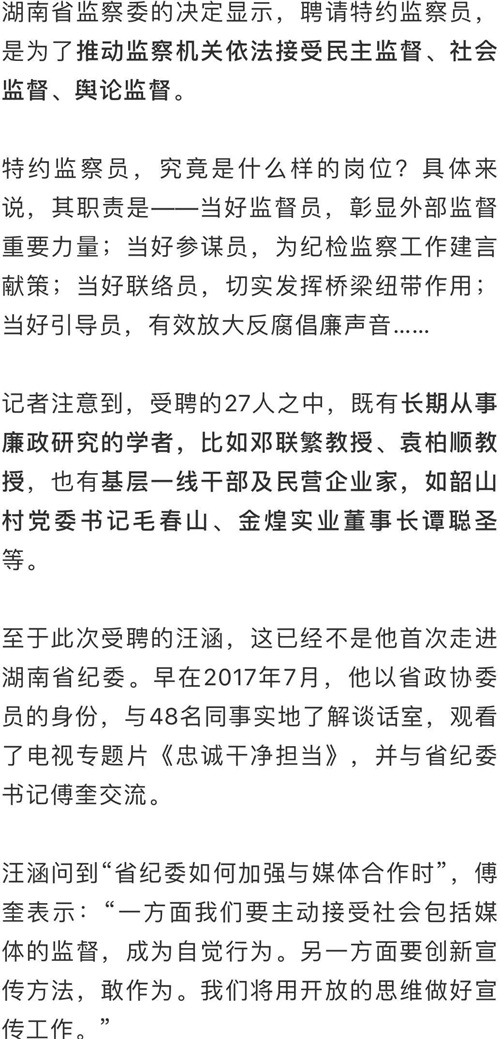 而汪涵并非唯一一位担任特约监察员的主持人。去年12月,国家监委优选聘请50名特约监察员,央视主持人海霞在列。实际上,她早已在中央纪委有特殊兼职——从2013年起,便是中央纪委监察部特邀监察员。