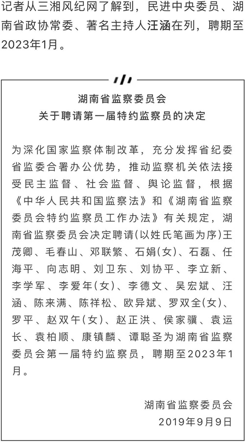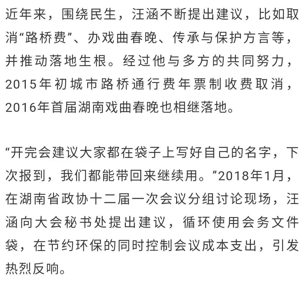记者注意到,加入中国民主促进会,是在汪涵任省政协委员期间。2014年4月,他前往民进湖南省委机关,汇报自己希望加入的一些想法。随后,他加入了民进大家庭。2015年12月,在民进十三届四中全会上,他又被增补为民进中央委员。