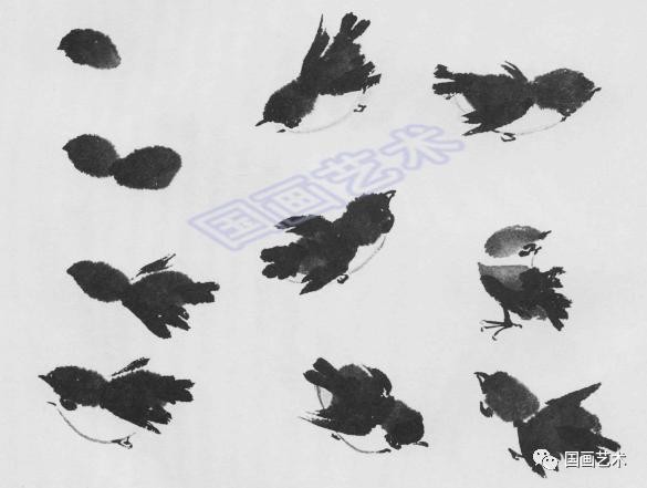 饱蘸浓墨,笔尖蘸浓墨,侧锋点画头部,点画背部。浓墨画出翅膀、尾巴,细笔勾画出嘴部、眼部、胸部、爪子。各种不同动态的小鸟。