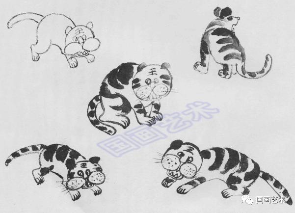 中锋淡墨画出虎的外形,侧锋蘸浓墨画出虎身花纹;画出不同动态的虎。
