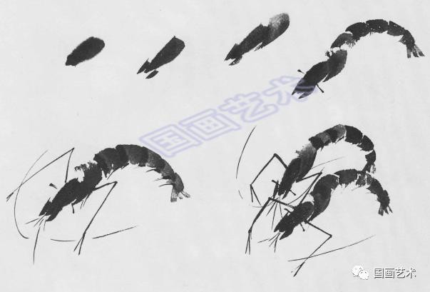笔尖浓墨,侧锋点画。中锋行笔;侧锋行笔,画出眼睛;中锋画钳、须、脚。两虾同游。