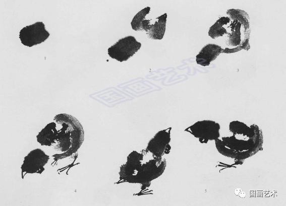 1.饱蘸淡墨,侧锋点画头部;2.点画翅膀;3.笔根着纸,画出尾部、腿部;4.狼毫笔画出嘴、眼、爪子;5.两鸡相视。