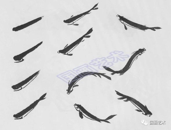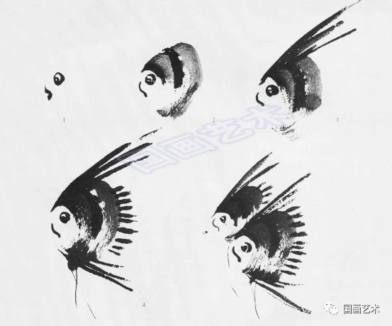 1.中锋;2.笔尖蘸浓墨,侧锋运笔;3.拖出背鳍;4.点画尾部;5.前后重叠。