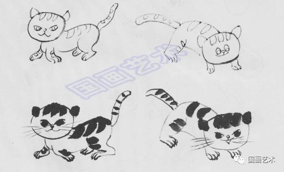 中锋淡墨画出猫的外形,侧锋画出猫身上的花纹(笔尖蘸浓墨),染出猫眼,浓墨画爪。