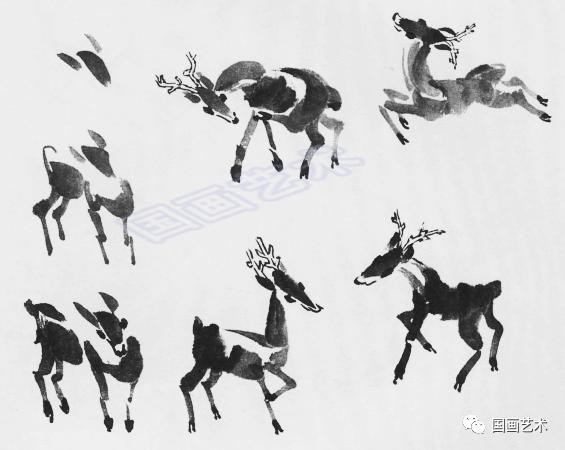 侧锋画头、耳、背、胸、肚部位;中锋画四只脚;浓墨点画眼、嘴和脚蹄,画出鹿角。