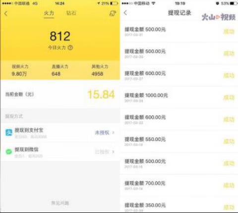 用户在火山发布的视频,是以火力来计算收益的,10火力就相当于1人民币。