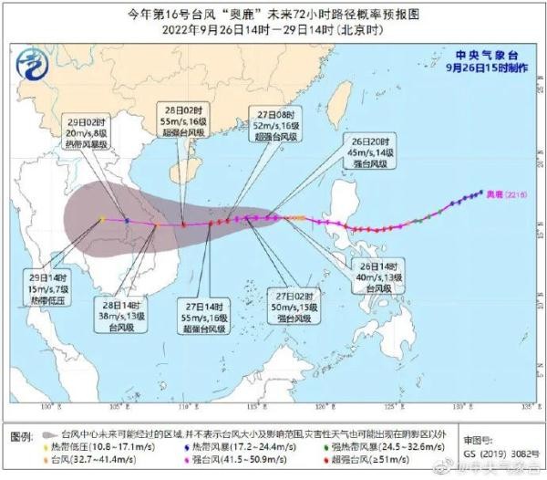 温馨提醒,台风“奥鹿”将穿过南海中部海面