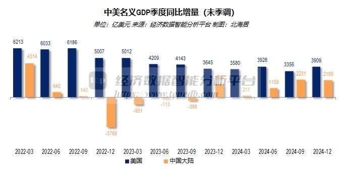 2024年,中国大陆名义GDP规模降至美国的64.9%,较上年降低了1.34个百分点,比高峰时(2021年)降低了11.91个百分点。