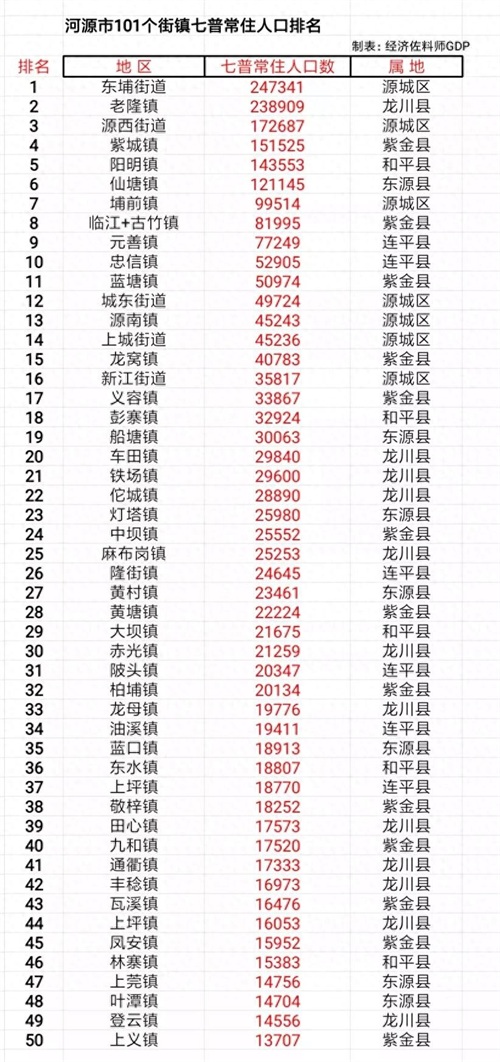 河源市101个街镇常住人口数据,东埔街道、老隆镇超20万人