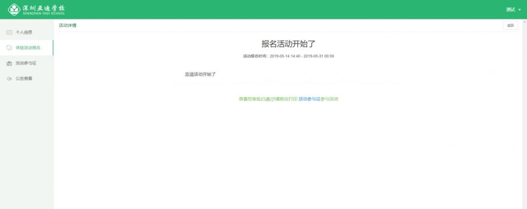 6. 报名成功并且学校审批通过后就可以去打印活动参与证参与活动了。