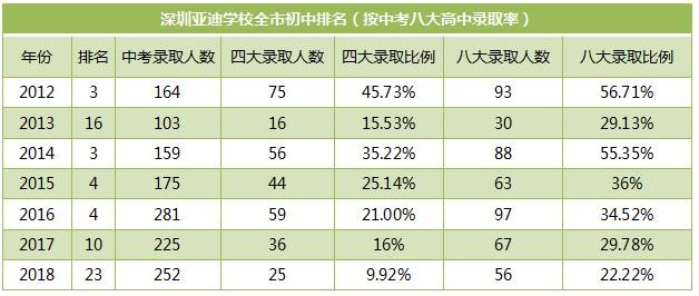 亚迪的超常班非常厉害,从2006年起,连续出过两个中考状元,其中在2010年的中考状元颜天成同学还被直接推荐至清华就读。2011年与2012年,广东省理科状元与特殊高考状元分别花落亚迪。
