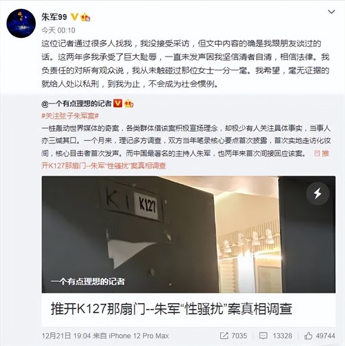 然而就在朱军事业如日中天之际,一场突如其来的风暴,却让这座高峰轰然倒塌,2018年,一名叫做弦子的女子,在网上指控朱军曾对她实施性骚扰。