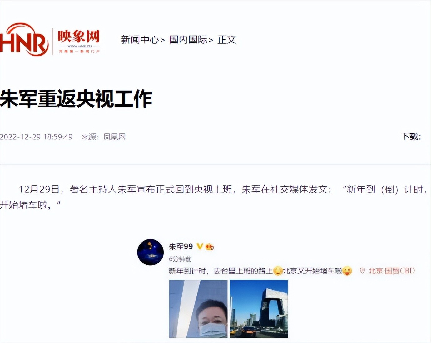 映象网 2022-12-29 关于《朱军重返央视工作》的报道