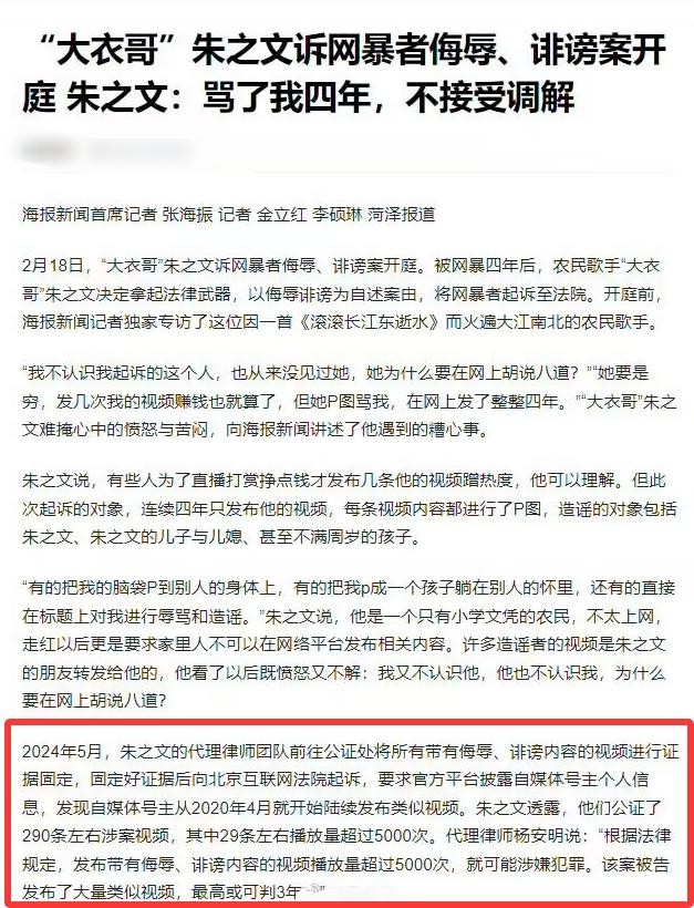 根据朱之文的代理律师杨安明表示,施暴者发布的大量都带有侮辱、诽谤性质的视频,这些都是犯法行为,根据规定最高或可判3年。