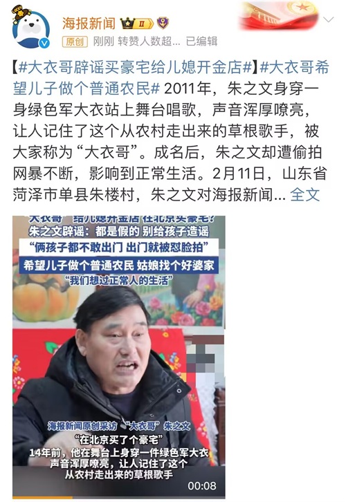 朱之文是一个来自山东的农民歌手,被网友们亲切地称呼为“大衣哥”。