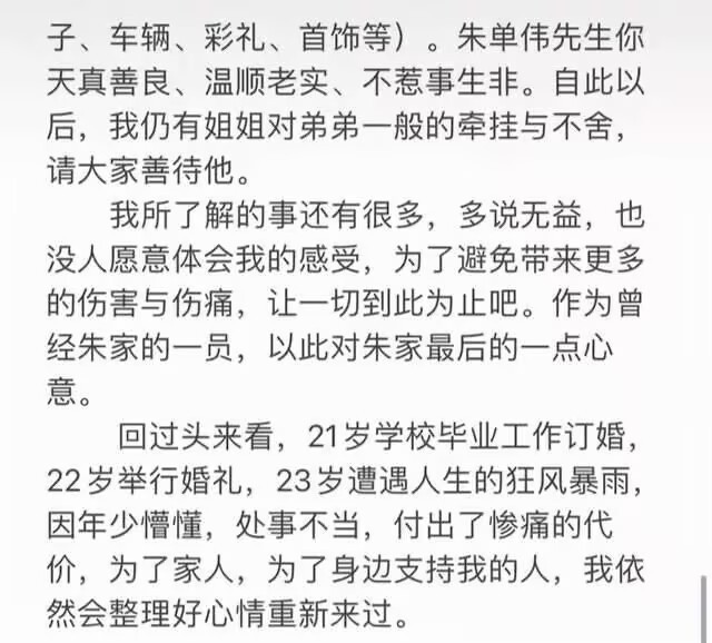 尽管如此,陈亚男也没有以德报怨,她还表示前夫朱单伟是一个善良、老实的人,希望大家善待他。