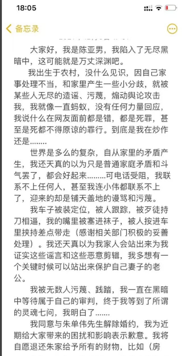此外,陈亚男在宣布离婚后,她的母亲还出面退还朱之文一家给的全部彩礼以及车房,她希望网友不要再对她的女儿施暴。