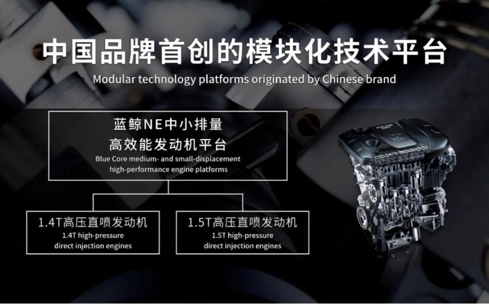 蓝鲸BlueCore发动机应用了:双可变气门正时(DVVT)、全铝机身材质、内部和外部废气再循环(i-EGR和e-EGR)、高压缸内燃油直喷(GDI)、双涡管电控涡轮增压、正时链条低摩擦、缸盖集成排气歧管。