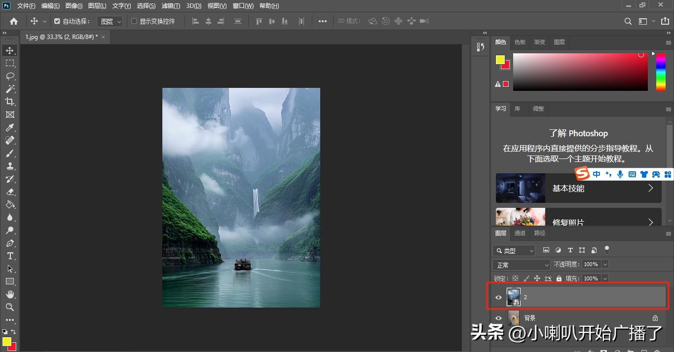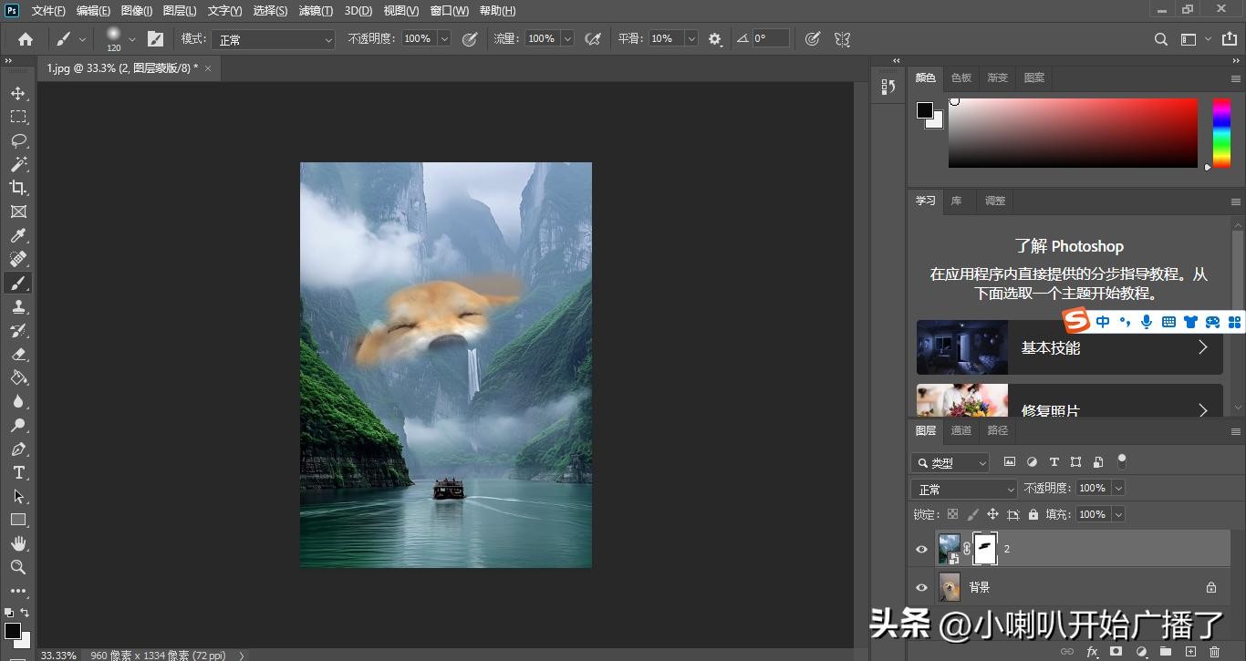 假设想让底层图片中的狗显示到上层的风景图片中,如下图,如何使用PS蒙版实现?