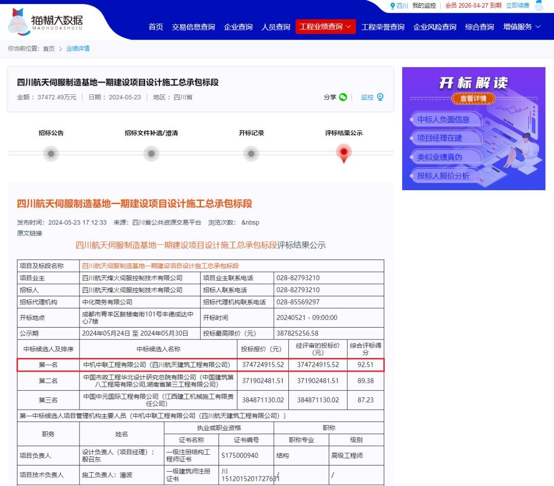 该项目于5月21日正式开标,招标控制价设定为3.87亿元。此次项目吸引了9家公司参与投标,最终中机中联工程有限公司携手四川航天建筑工程有限公司以3.74亿元的报价成功中标。
